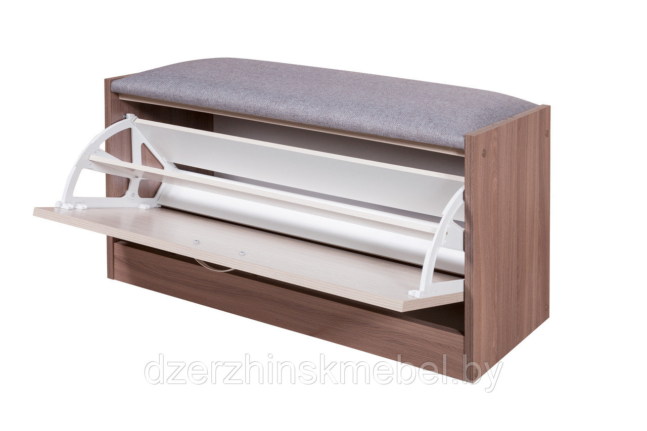 Мягкое сидение позволит с комфортом разместиться для переобувания. Обувница, за удобной откидной дверью, разместит до шести пар обуви. С нашей скамьей Вы сэкономите пространство в прихожей и сохраните Вашу обувь в идеальном порядке.