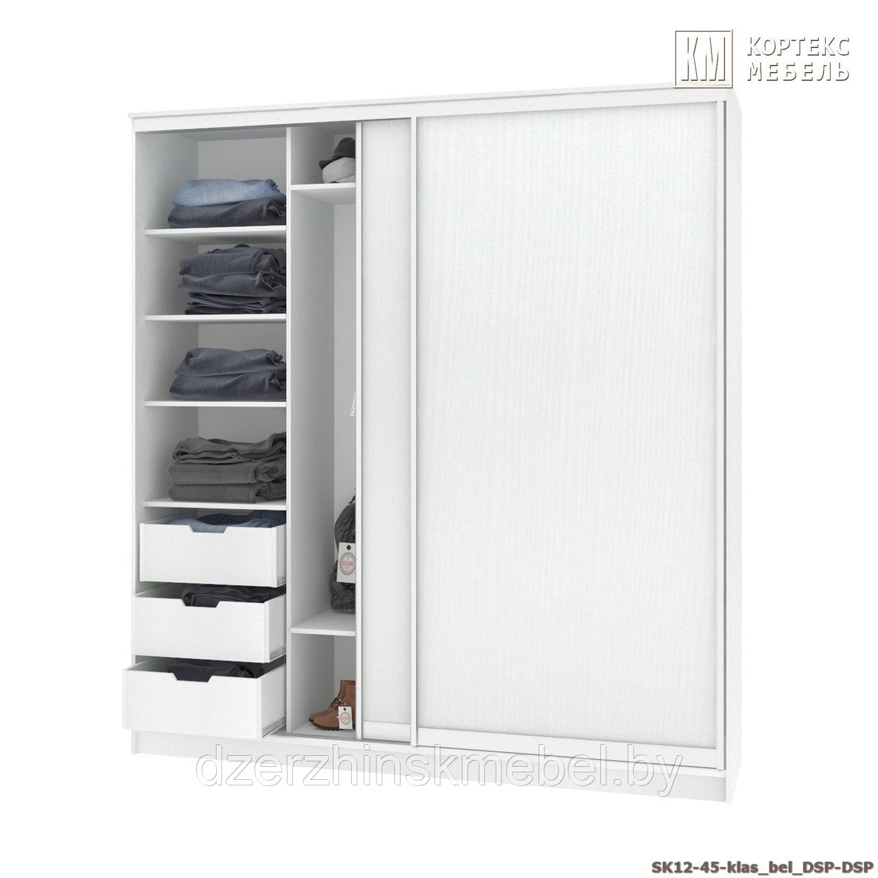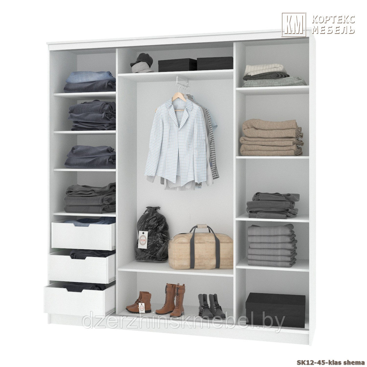 Современный 2-дверный шкаф-купе шириной 205 см. производства ЧПУП «Кортекс-мебель». Глубина шкафа 45 см. делает его удобным для использования в прихожих и небольших помещениях. Встроенные выдвижные ящики станут приятным дополнением для удобного хранения полезных мелочей и небольших предметов гардероба.