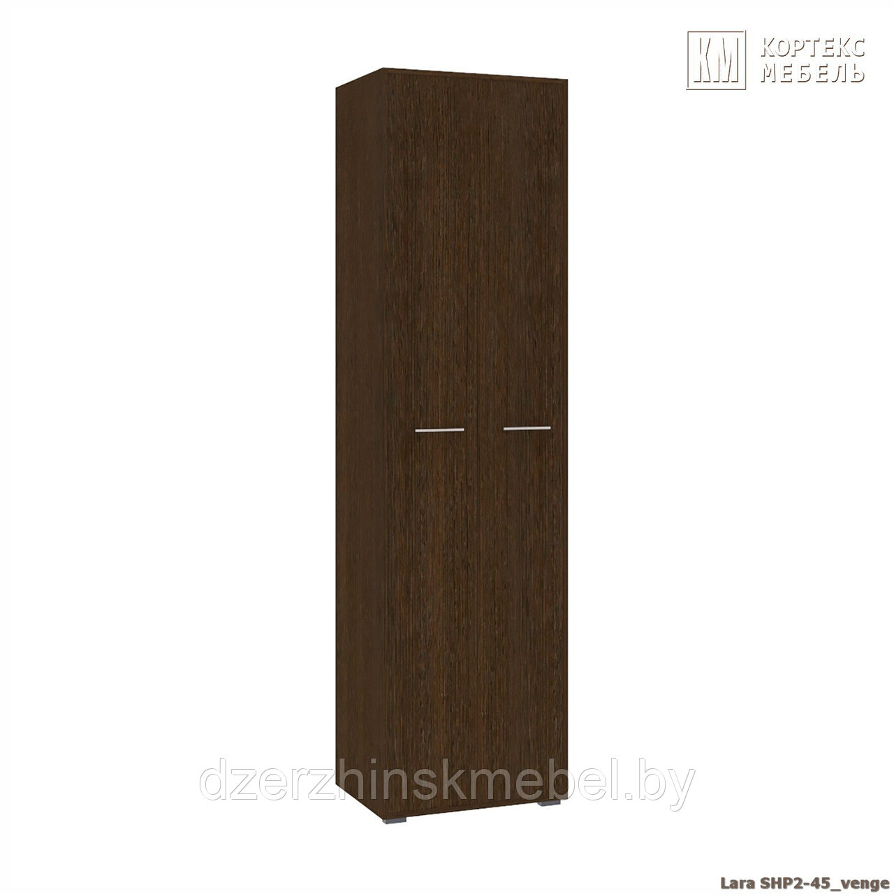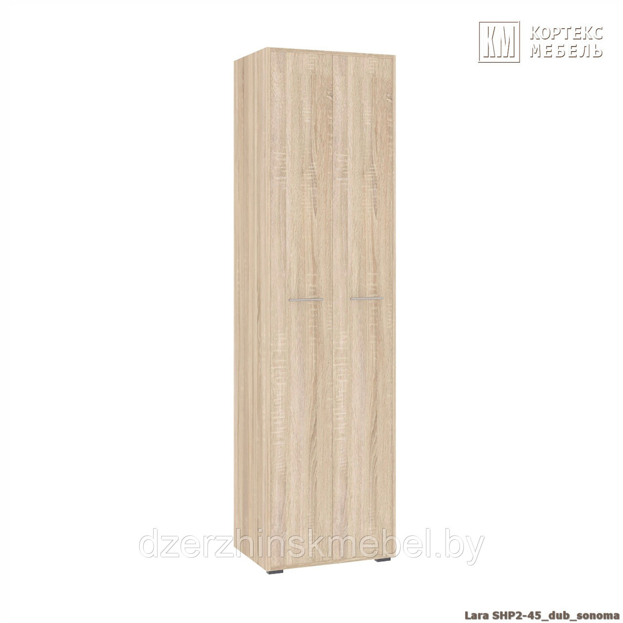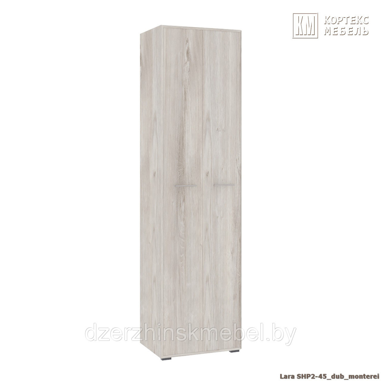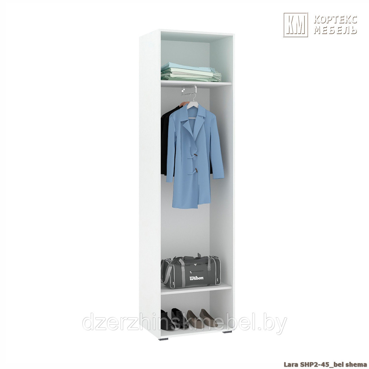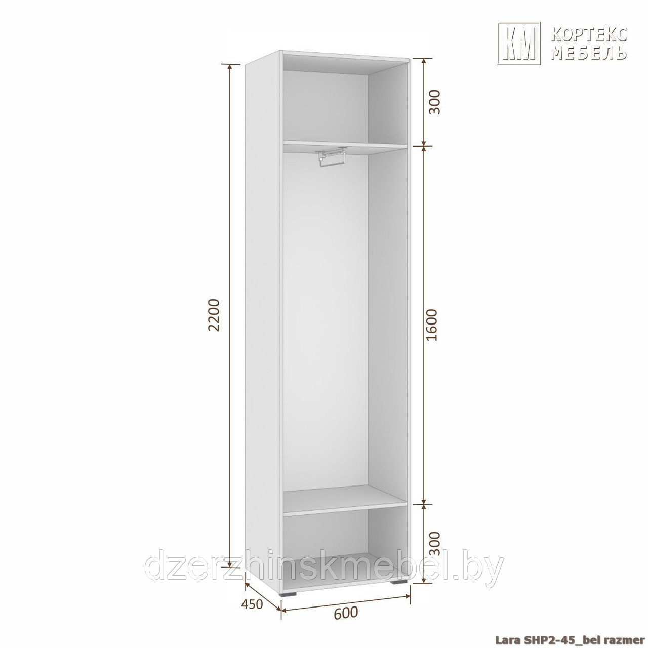 Шкаф в прихожую ЛАРА ШП2-45 производства «Кортекс-Мебель» имеет одно вместительное отделение, оснащенное выдвижной вешалкой для хранения верхней одежды на плечиках, нижнюю полку и антресоль.